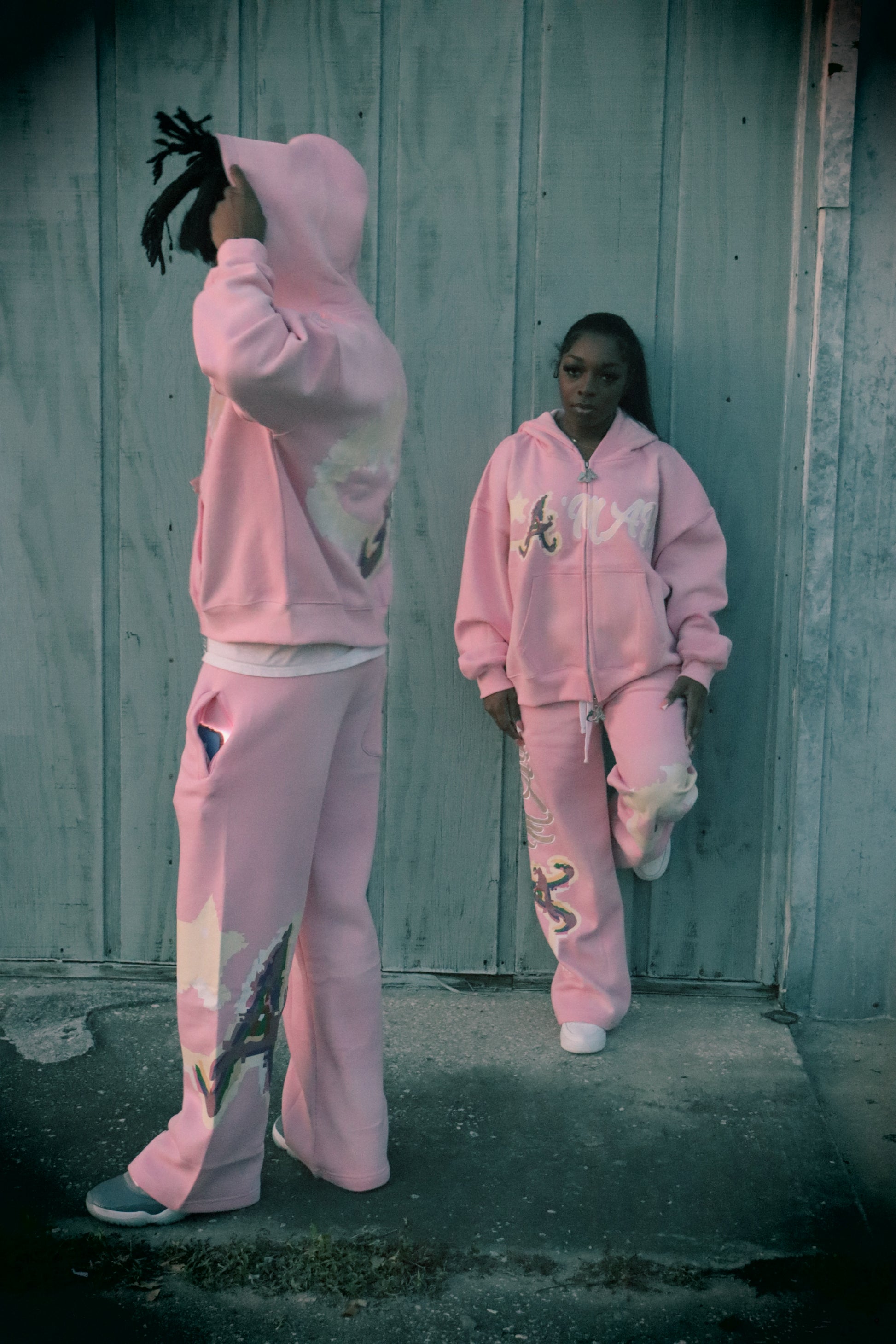 Male model in Pink is 5'10 wearing a size (1) Xs-L Zip up & Small bottoms.Female Model is 5'2 wearing a size(1) also with Xsmall bottoms
